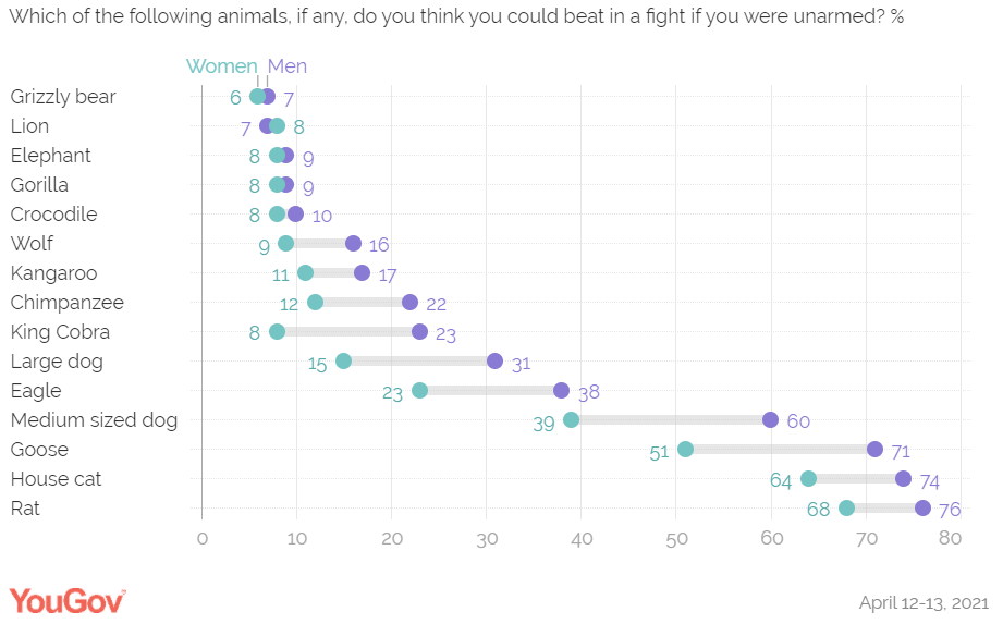 El 7% de los hombres estadounidenses y el 8% de las mujeres aseguran que podrían ganar a un león en una pelea. Es una encuesta de YouGov cuyos datos completos podemos ver aquí arriba y que demuestran, básicamente, que los americanos son unos flojos y unos cobardes que no son nada sin sus pistolitas y sus Schwarzeneggers. Cualquier español de bien puede vencer a un león, a un oso o a un cocodrilo con sus propios puños, además de alguna que otra patada y un buen cabezazo. Quizás no los milenials, porque ya tienen cuarenta años y están viejos, pero el resto sí: los más jóvenes (a partir de los ocho años, calculo), por el vigor que da la juventud, y los más viejos, por la astucia y la experiencia que se aprende colándose en el ambulatorio para largarse antes con las recetas.
